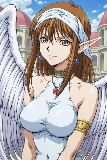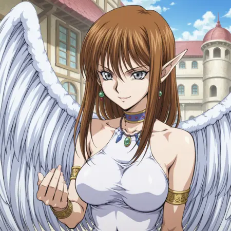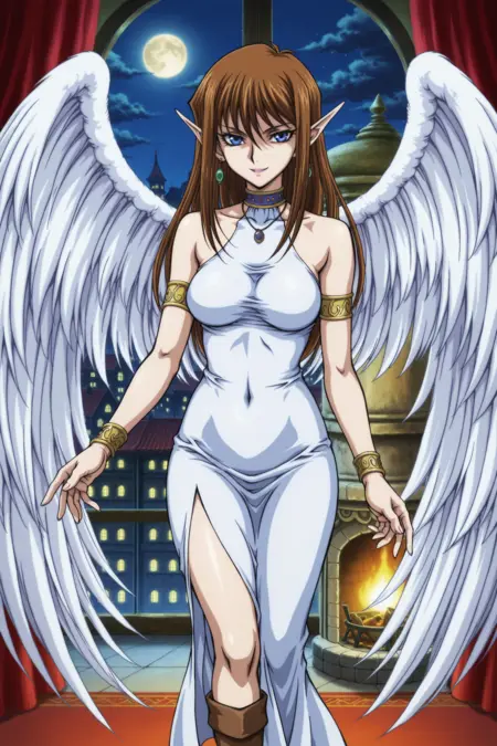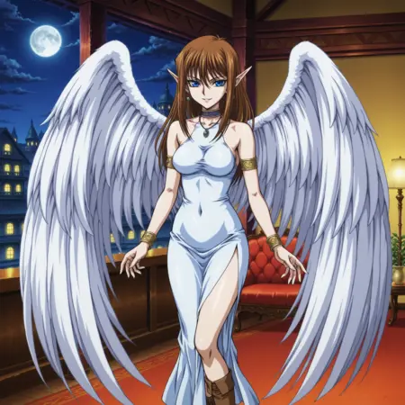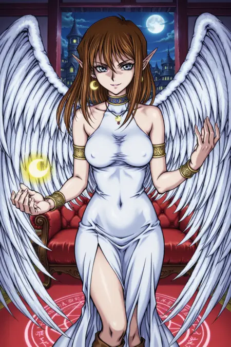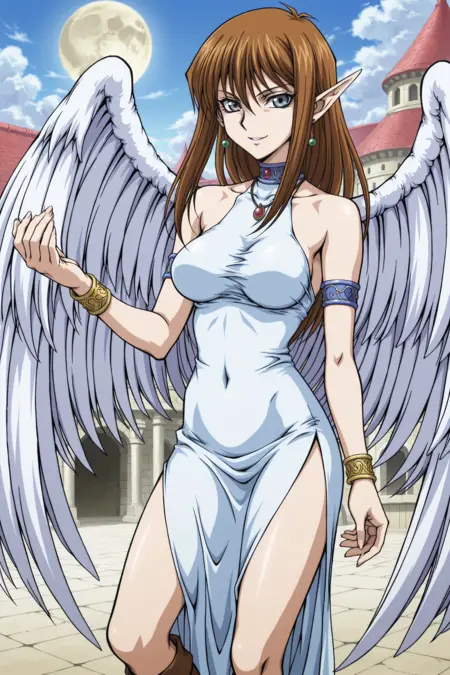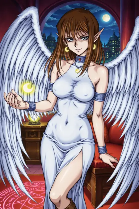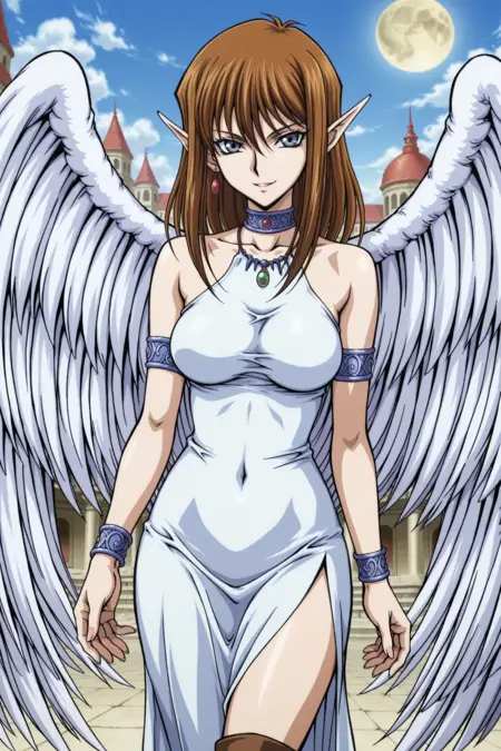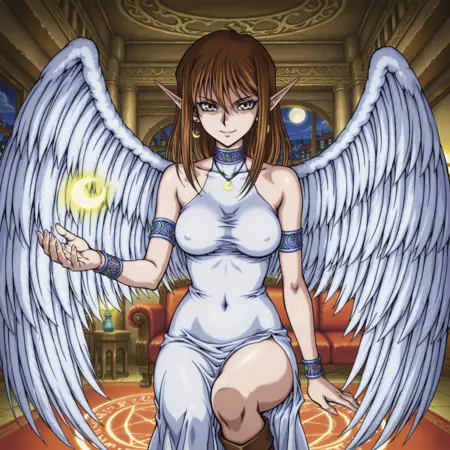 yugioh_card_style, yugioh_card_for_maiden_of_the_moonlight, pointy ears, grey eyes, brown hair, long hair, jewelry, fantasy jewelry, earrings, necklace, bracelets, large breasts, collarbone, covered navel, smile, choker, angel wings, halterneck, white sleeveless dress, armlet, brown boots