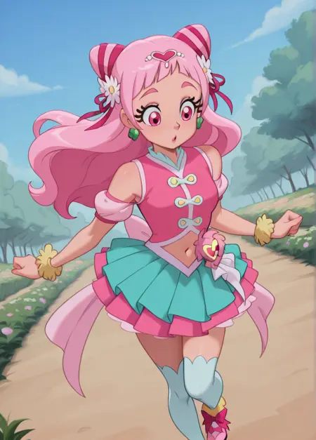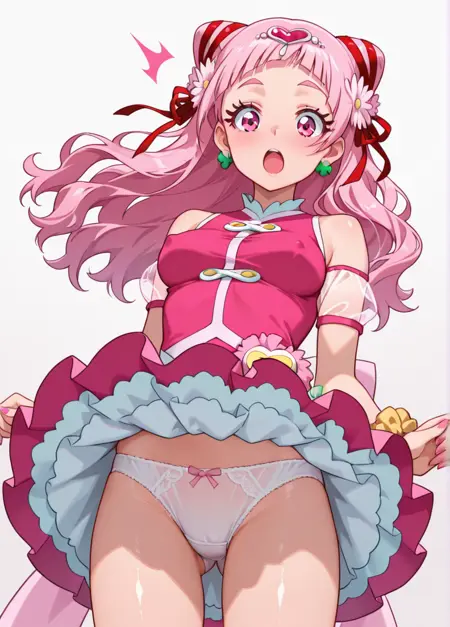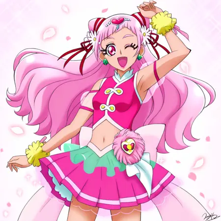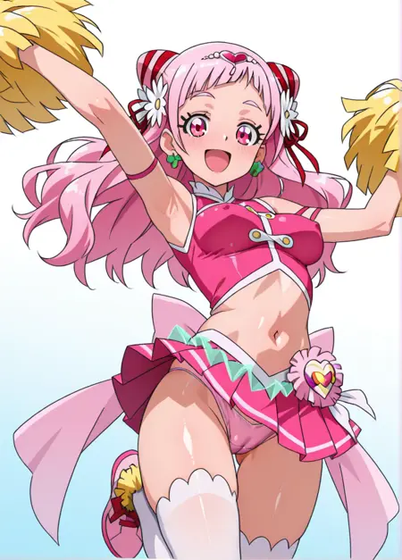 pink shirt, miniskirt, hair ornament, thighhighs, bow, navel, navel cutout, ribbon, jewelry, earrings, pleated skirt, shoes, sleeveless shirt, midriff, footwear bow, layered skirt, pink footwear, magical girl,