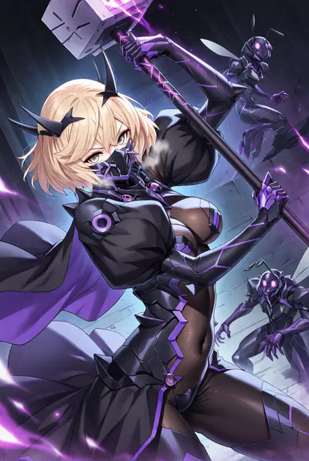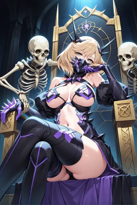 purple and black theme , hair ornament , ( mask ) bikini armor , halterneck , puffy sleeves , gold trim , detached sleeves , purple gloves , spikes , underbust , navel , waist cape , armored boots / thighhighs , asymmetrical legwear ;