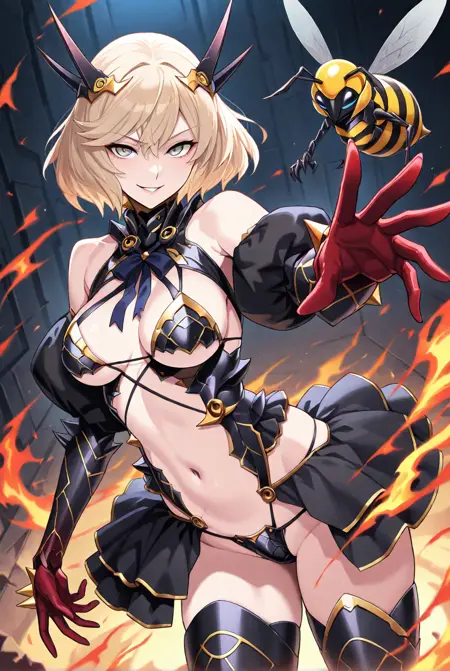 yellow and black theme , hair ornament , bikini armor , halterneck , bowtie , puffy sleeves , gold trim , detached sleeves , red gloves , spikes , underbust , navel , layered skirt , armored boots ;