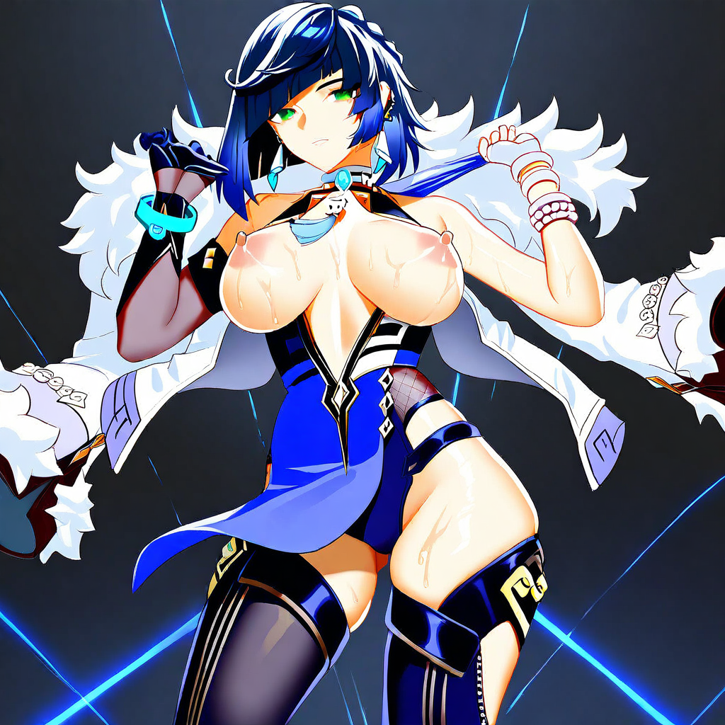 (Genshin_Yelan, 단발, 앞머리, 파란 머리, 녹색 눈, 보석, 귀걸이, 장갑, 털 장식, 주사위, 재킷, 허벅지 긴 양말, 레오타드, 드레스),