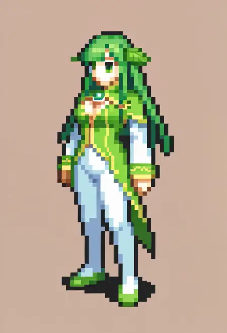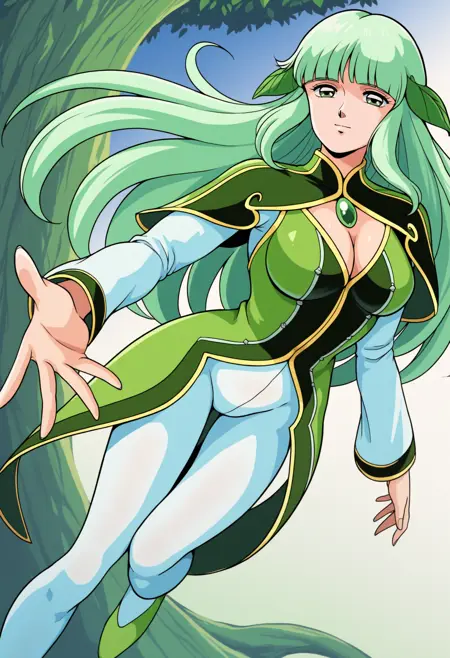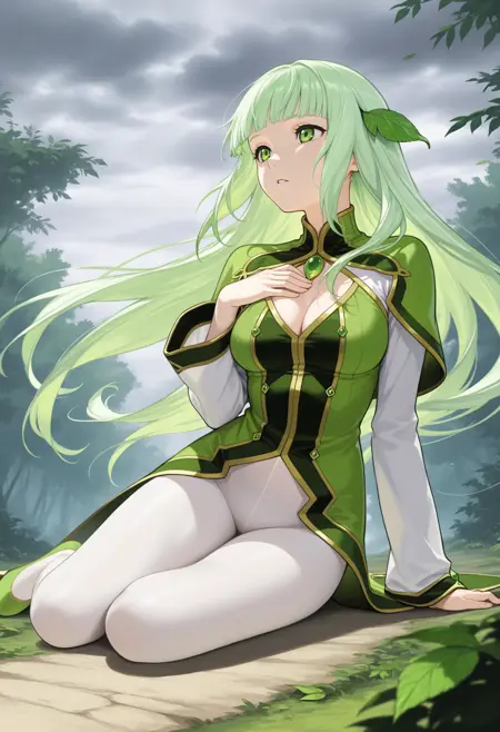 기본 외모: 마르텔, 녹색 머리카락, 긴 머리카락, 둔한 앞머리, 잎 모양 머리 장식, 녹색 눈, 녹색 재킷, 터틀넥, 브로치, 가슴 절개, 중간 크기의 가슴, 긴 소매, 흰색 소매, 흰색 팬티스타킹, 코어테일, 평발, 녹색 신발