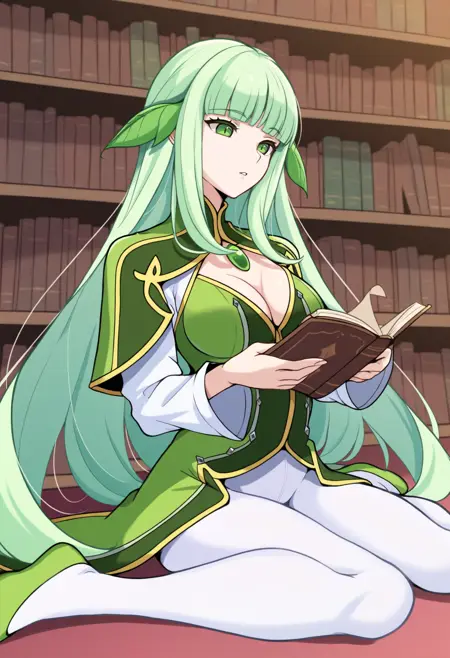 맞춤 옷차림: 마르텔, 녹색 머리카락, 긴 머리카락, 둔한 앞머리, 잎 모양 머리 장식, 녹색 눈