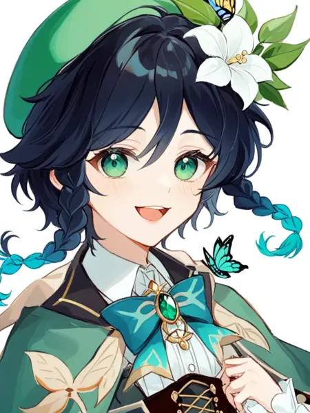 触发词:(\wen di\),1boy,smilecollared cape,cape,white,shirt,white shirt,jewelry,collared shirt,hat flower,gem,brooch,hair ornament,