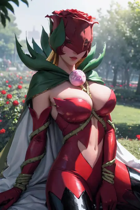- 过膝袜,乳沟,花瓣,肘部手套,露脐设计,红花,红色手套,紧身衣,面具,尖刺,斗篷,手套,藤蔓,玫瑰,花朵,植物,