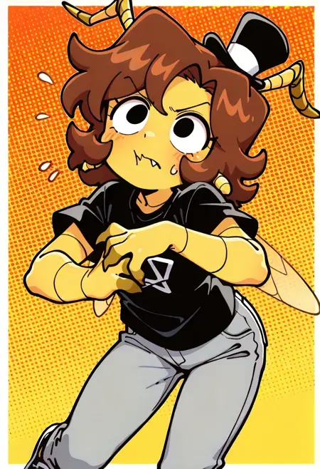 | トレーニングワード | Ditas, 1girl, insect, grasshopper, yellow body, brown hair, yellow-brown antennae, black t-shirt, grey pants, black-white shoes, distinctive claw-like hands, small black top hat, black eyes,コピーしました! Ditas, 1girl, peach skin, brown hair, black t-shirt, grey pants, black-white shoes, small black top hat, black eyesコピーしました! |