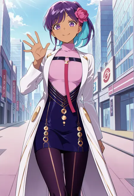 Notable tags: dark skin, purple hair, purple eyes, braid sidelock, ponytail, hair flower, multicolored hair, blue hair, jewelry, tight clothes, pink sweater, strap, pencil skirt, lab coat