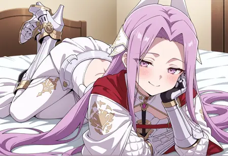 3rd: absurdly long hair, purple hair, purple eyes, hair ornament, backless shirt, capelet, strap, white leggings, waist cape, armored boots, detached sleeves, armored gloves