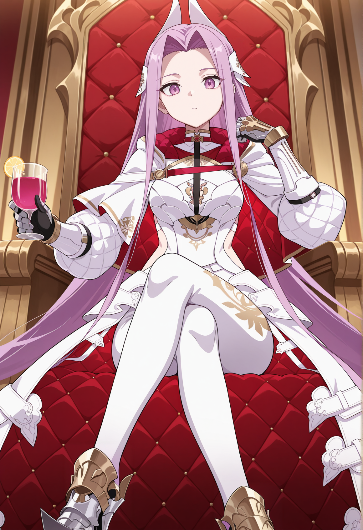 2nd: absurdly long hair, purple hair, hair ornament, visor, long dress, side slit, armor, shoulder pads, gauntlets, greaves,