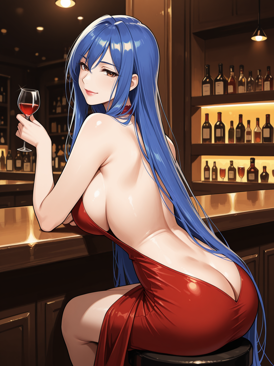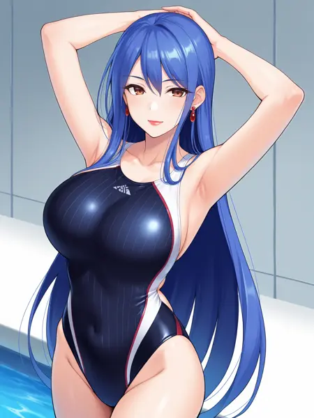 Apperance: aidaaoi, blue hair, very long hair, brown eyes, large breasts, mature female, light lipstick