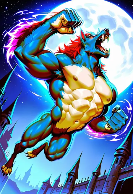 werewolf, blue skin, red hair, arm hair, thick arm hair,