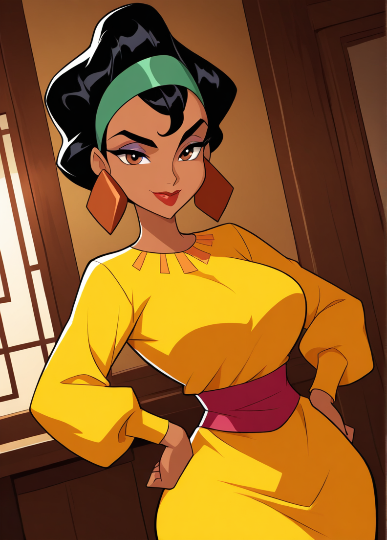 If you wish to place her in her traditional clothes, add these to the prompt: