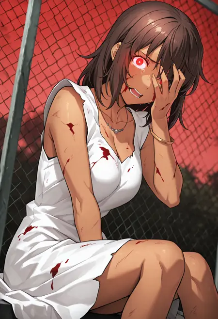 shirleyshito, blood on face, glowing eyes, red eyes,