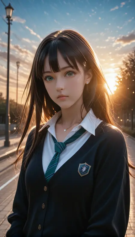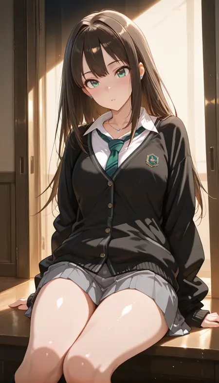 shirt, skirt, long sleeves, school uniform, collarbone, white shirt, thighs, pleated skirt, necktie, collared shirt, socks, miniskirt, striped clothes, sweater, sleeves past wrists, kneehighs, dress shirt, black socks, cardigan, grey skirt, black sweater, striped necktie, green necktie, open collar, loose necktie, diagonal-striped clothes, black cardigan, diagonal-striped necktie, earrings, jewelry, necklace, buttons, stud earrings, jaggy lines,