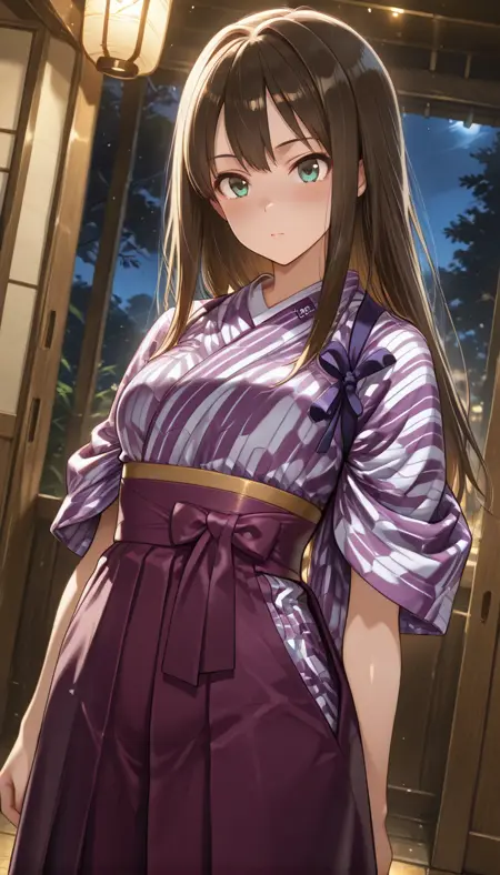 skirt, short sleeves, japanese clothes, wide sleeves, kimono, hakama, hakama skirt, sleeves rolled up, purple skirt, waitress, red hakama, hakama short skirt, tasuki, purple kimono, meiji schoolgirl uniform, yagasuri, purple hakama,
