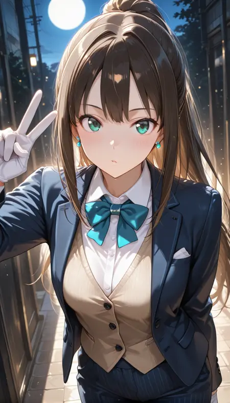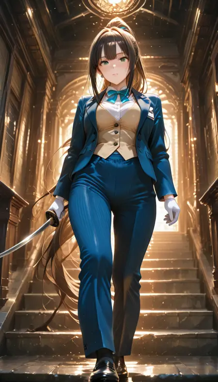 shirt, long sleeves, gloves, bow, jacket, white shirt, ponytail, collared shirt, pants, white gloves, bowtie, striped clothes, vest, open jacket, buttons, black pants, blue bow, blue jacket, formal, suit, blue bowtie, blue pants, traditional bowtie, brown vest, aqua bow, pinstripe pattern, aqua bowtie, striped pants, pant suit, yellow vest, vertical-striped pants, blue suit, jewelry, earrings
