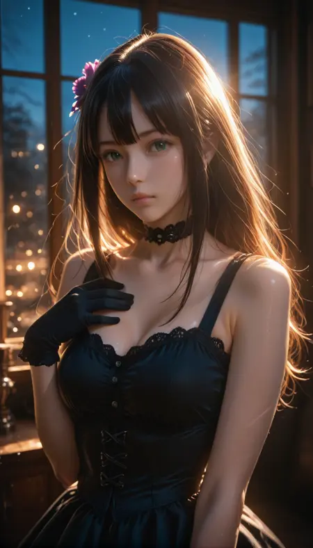 hair ornament, gloves, dress, bow, ribbon, cleavage, jewelry, bare shoulders, collarbone, hair ribbon, flower, thighs, frills, sleeveless, black gloves, choker, hair flower, black dress, bare arms, sleeveless dress, black bow, black ribbon, black choker, buttons, short dress, frilled dress, gem, corset, purple flower, underbust, double-breasted, frilled choker, dress bow, frilled gloves, pendant choker, purple gemstone, brooch,