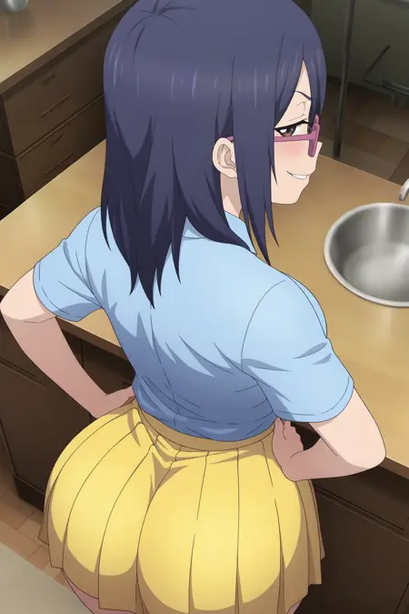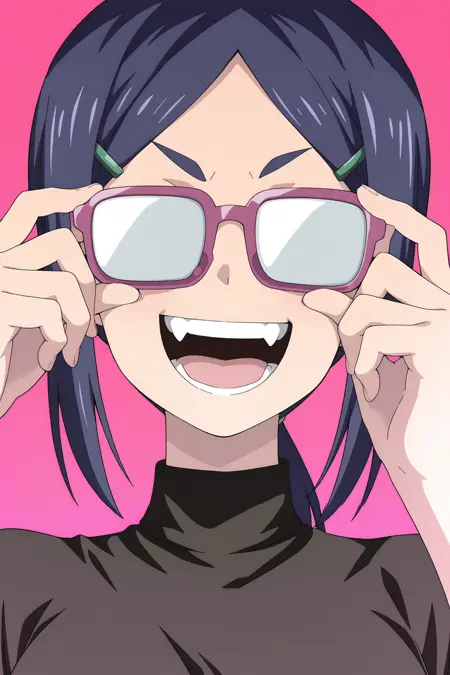 ami、ダークブルーの髪、ダークブラウンの目、ピンクフレームの眼鏡、濃い眉、分け目のある前髪、グリーン(イエロー)のヘアクリップ