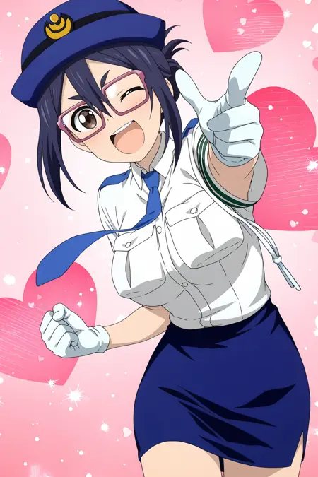 警察官制服:女性警察官、制服、帽子、白シャツ、短袖、青いネクタイ、青いスカート、ペンシルスカート