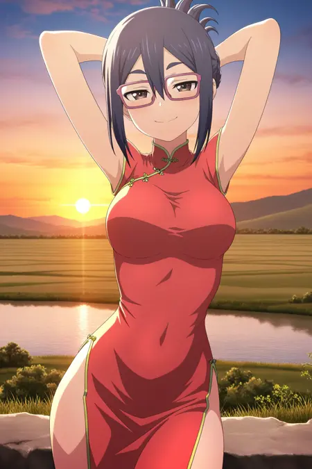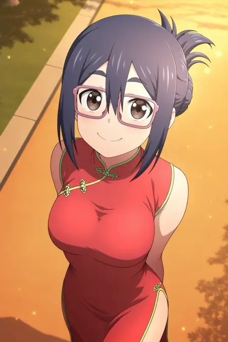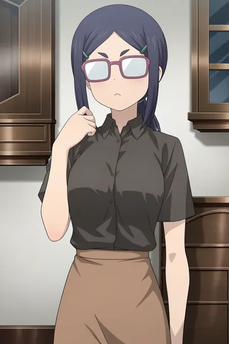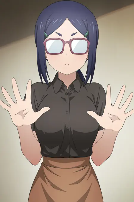 ami, dark blue hair, dark brown eyes, pink-framed eyewear, thick eyebrows, parted bangs, green (yellow) hairclip