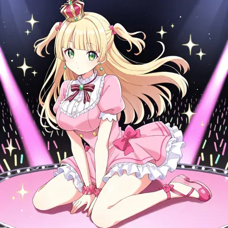 Superstar (light evolution for Idol): Pockegal, 074_av, blonde hair, green eyes, long hair, two side up, blunt bangs, crown, large breasts