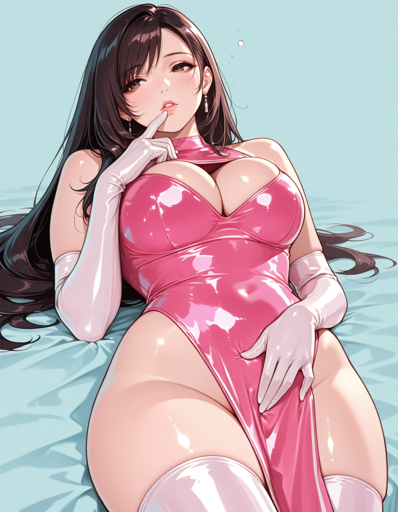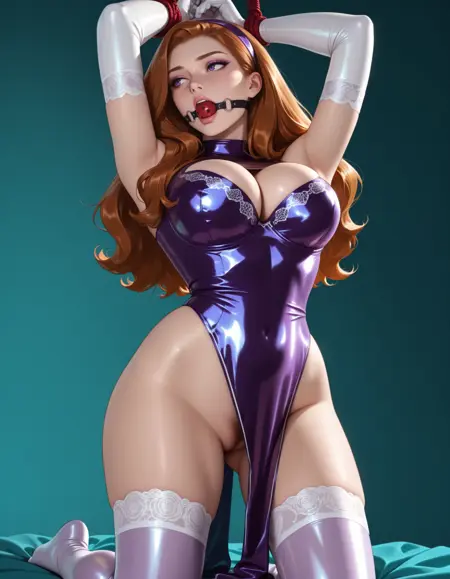 pelvic curtain, black clothing, shiny clothing, black leotard, black elbow gloves, cleavage cutout, thighhighs, curvy