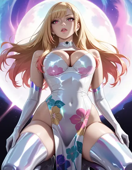 골반 커튼, 검은 옷, 빛나는 옷, 검은 레오타드, 검은 팔 장갑, 가슴 노출, 허벅지 긴 양말, 곡선형