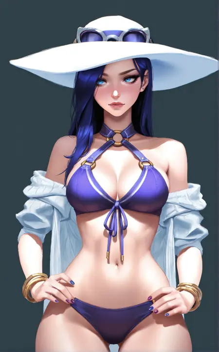 PP_Caitlyn, Long hair, blue hair, blue eyes, painted nails, cross straps, white transparent shawl, gold bracelets, blue bikini, neck ring, wide-brim white hat