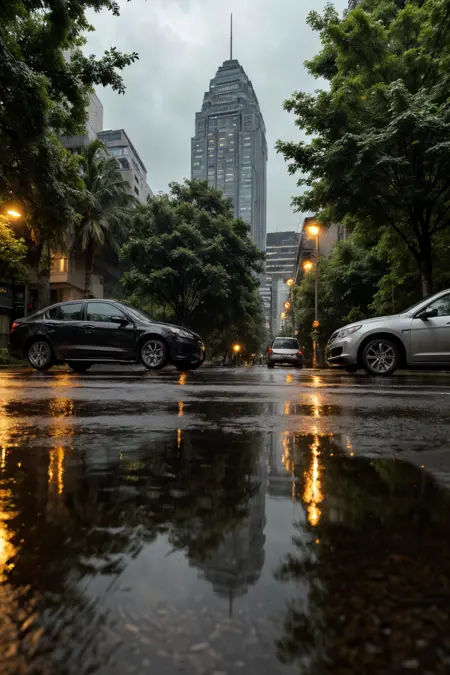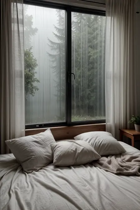 aesthetic rainy city street at night, reflections on the road, soft orange lights, cinematic moodmisty forest path during rain, moss-covered trees, puddles on the trail, natural overcast lightreading a book by the window while it rains outside, calm mood, soft shadows, aesthetic