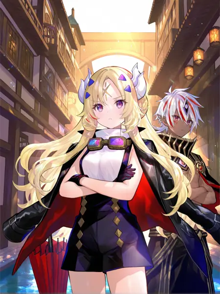 タグ(キャラクター1-服1-1):手袋、銀色の装甲ブーツ、白い腰マント、紫のリボン