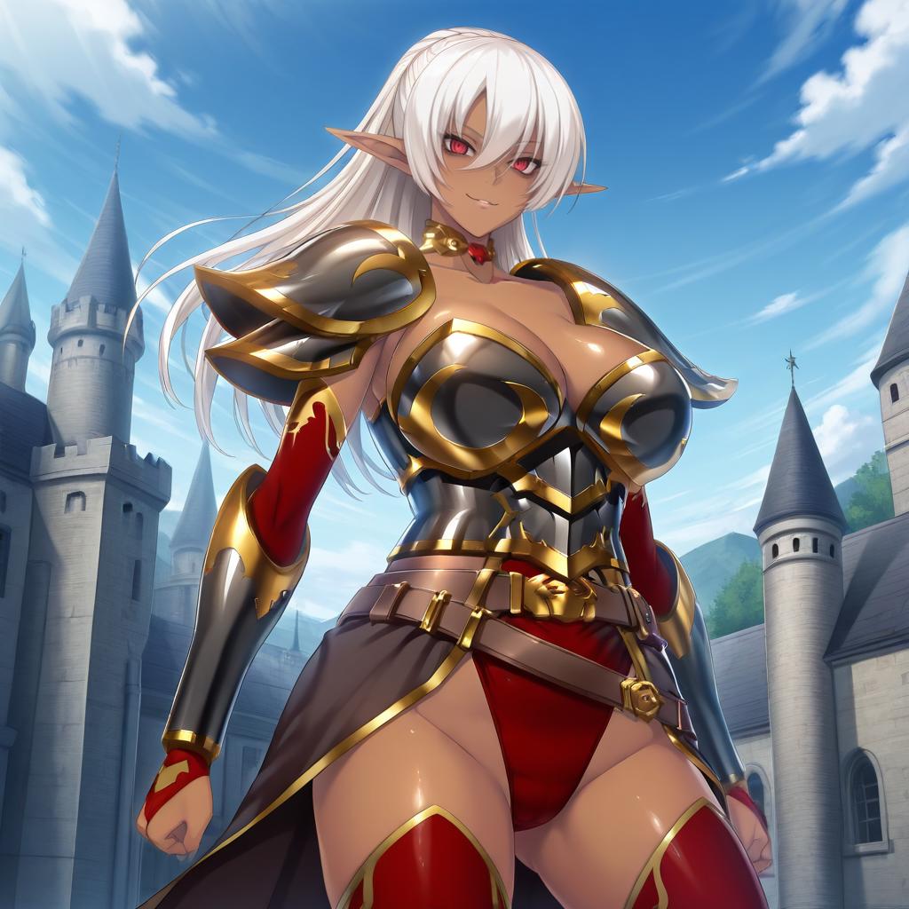 - Narrus Linhen: 1girl, narrus, red eyes, silver hair, long hair, dark skin, pointy ears, elf,