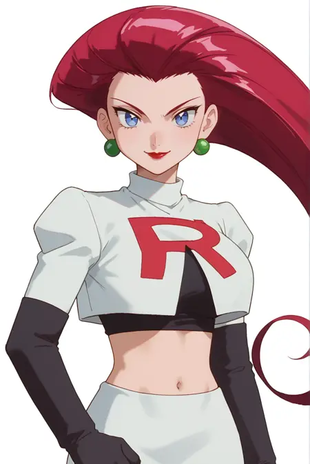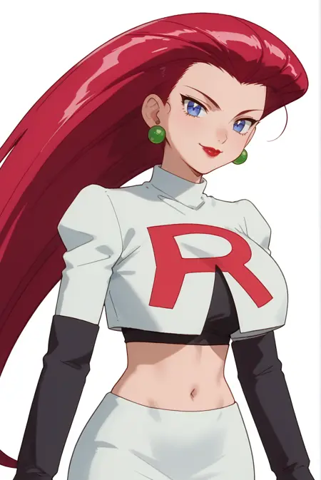 <lora:PokemonJessie-IL-v1-08:0.9>, ChopioJessie, very long hair, red hair, shiny hair, hair slicked back, red lips, blue eyes, white pupils, looking at viewer,