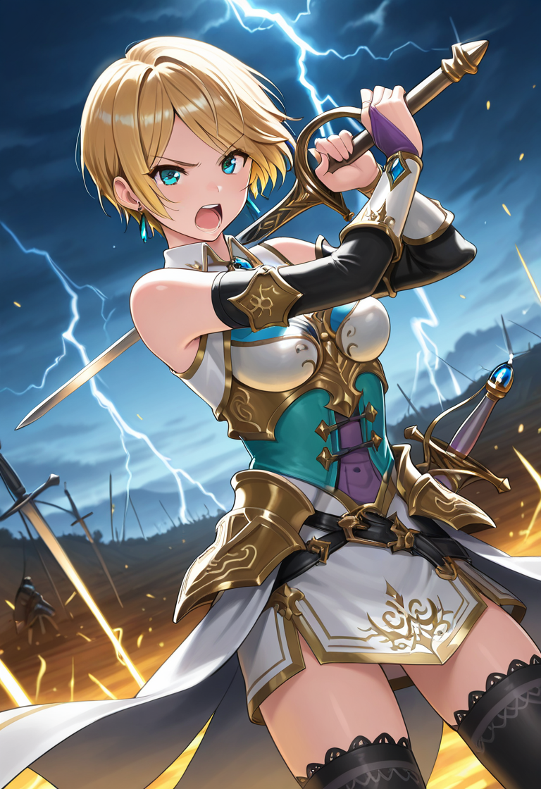 1girl, solo, breasts, short hair, blue eyes, simple background, skirt, blonde hair, thighhighs, jewelry, bare shoulders, weapon, earrings, black thighhighs, sword, armor, aqua eyes, zettai ryouiki, black background, bridal gauntlets, looking at viewer, medium breasts, standing, miniskirt, gem, sheath, lace-trimmed legwear