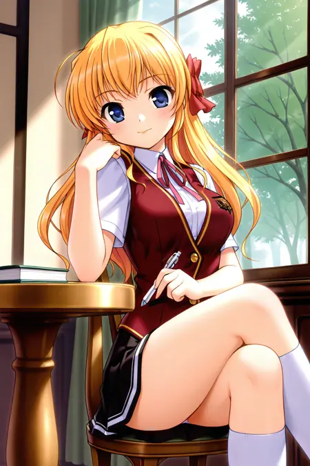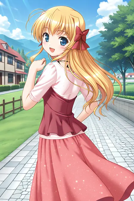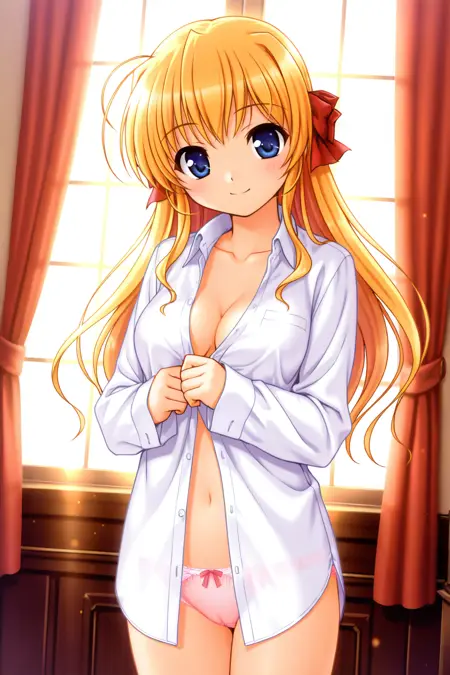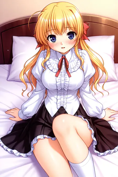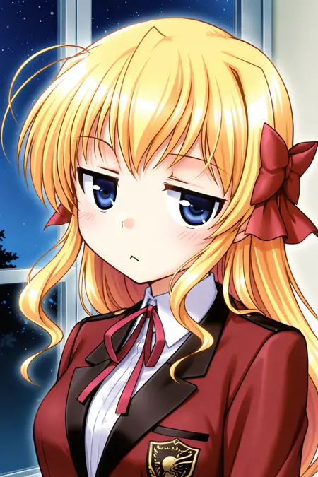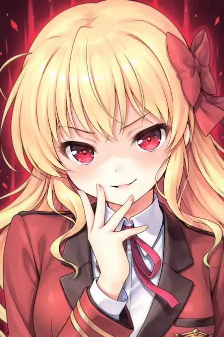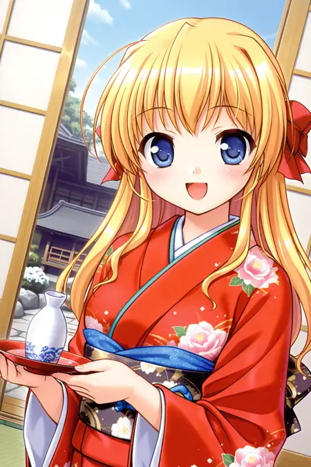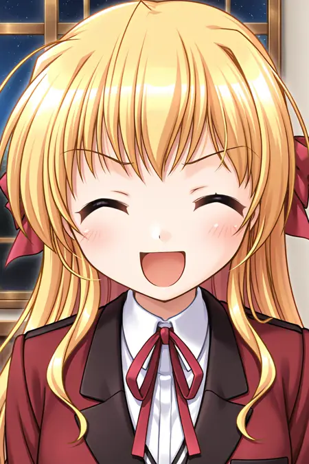 sendou erika,blue eyes,blonde hair,very long hair,wavy hair,hair bow,red bow,