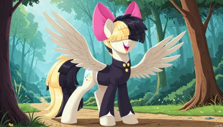 Songbird Serenade, pony body is light, wings are white, mane is yellow and black with bangs covering eyes, on head is a large pink bow, dressed in a short black suit with two royal buttons
