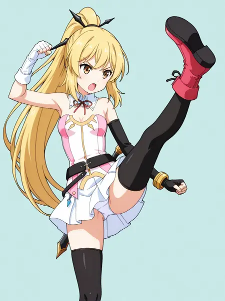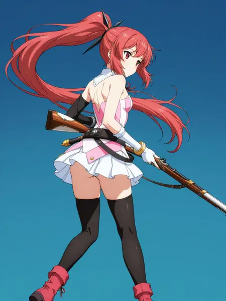 헤어 리본, 검은 리본, 머리 장식, 목 리본, 장갑, 어깨 노출, 치마, 분리된 소매, 단일 분리된 소매, 어긋난 소매, 비대칭 소매, 분리된 칼라, 단일 장갑, 손가락 없는 장갑, 불균형 장갑, 비대칭 장갑, 흰 장갑, 팔꿈치 장갑, 벨트, 빨간 리본, 어깨 밴드 드레스, 짧은 드레스, 주름 치마, 흰 치마, 미니 치마, 보석, 팔찌, 젯타이 류오키, 검은 허벅지 양말, 발목 부츠, 빨간 신발