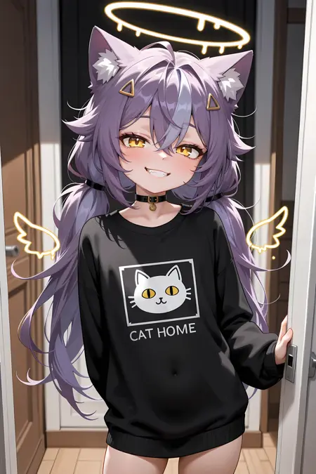 1girl,bangs,purple hair,long hair,yellow eyes,hair ornament,cat ears,tail,halo,twintails,flat chest,