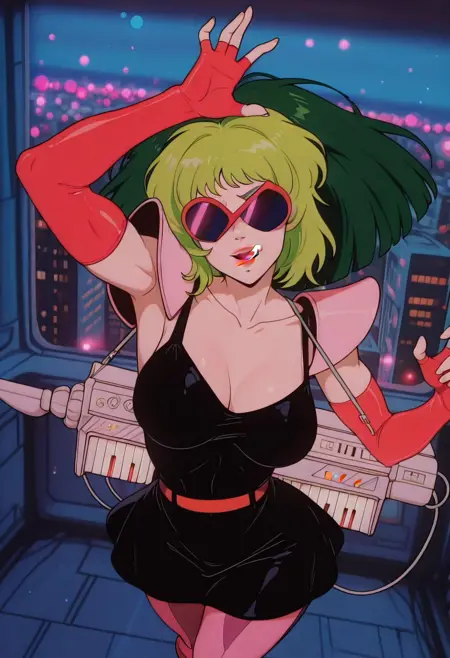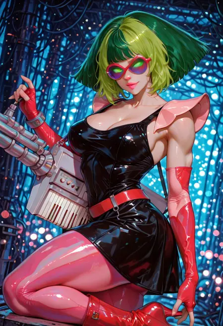 MelodiaSH,1个女孩,单独,曲线身材,双色头发,绿色头发,刘海,红色镜框的有色眼镜,粉红色嘴唇,锁骨,大乳房,乳沟,黑色连衣裙,粉红色肩甲,红色肘部手套,露指手套,红色腰带,粗大腿,粉红色连裤袜,肩垫,红色靴子,高跟鞋,背带式未来主义键盘吉他
