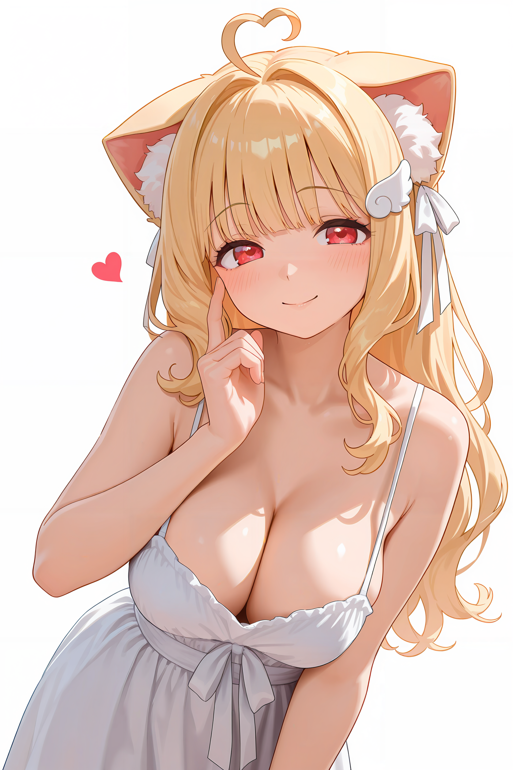 1girl,bangs,blonde hair,red eyes,cat ears,breasts,wing hair ornament,long hair,heart ahoge,tail,