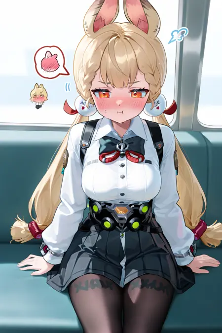alice thymefield, 1girl, blonde hair, yellow eye, red eye, hair ornament, heterochromia, red bow, bowtie, skirt, long hair, twintails, fingerless gloves, shirt, animal ears, pantyhose, white shirt, pleated skirt, long sleeves, black gloves, low twintails, black pantyhose