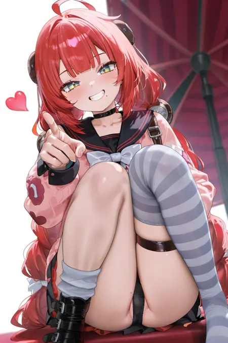 ukinami yuzuha, 1girl, green eyes, red hair, thighhighs, boots, striped clothes, long hair, skirt, bow, braid, striped thighhighs, very long hair, tail, sailor collar, black footwear, twin braids, ahoge, white bow, thigh strap, black skirt, choker, hair bow, black sailor collar, asymmetrical legwear, long sleeves, pleated skirt, bowtie, single thighhigh,