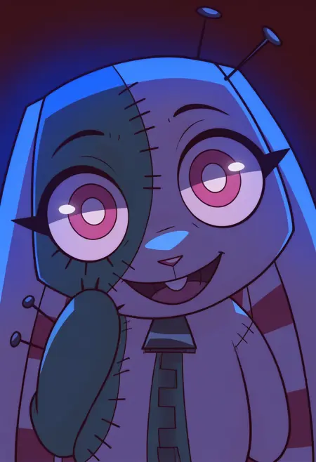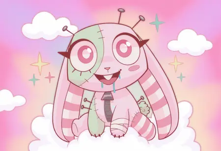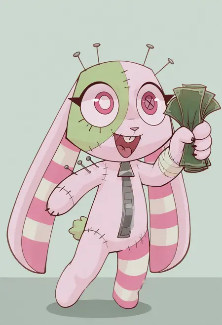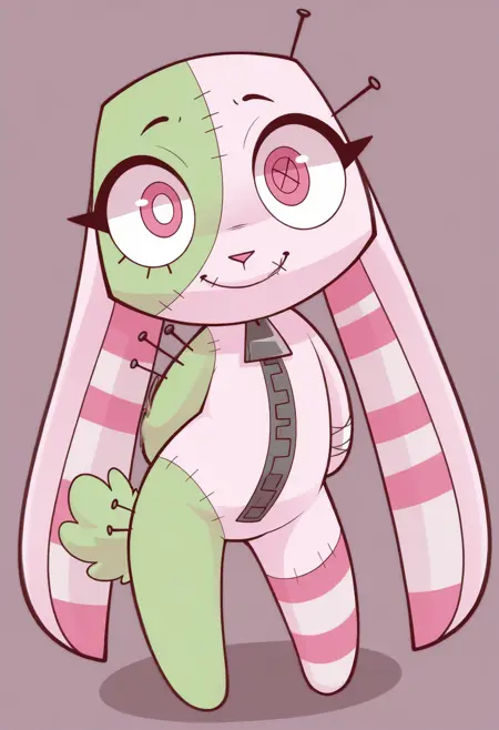 z1p, stitched bunny plush doll, green patch on face, striped pink and white ears, belly zipper, black pins in the head, tiny green tail, pink eyes, button eye