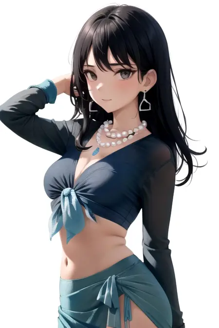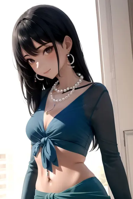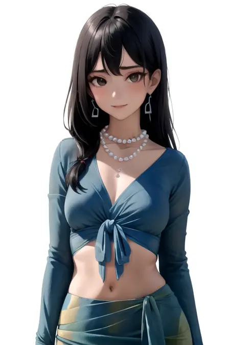 GreenPds, 1girl, jewelry, necklace, solo, black hair, long hair, earrings, blue sarong, black eyes, blue shirt, long sleeves, midriff, breasts, crop top, front-tie top, pearl necklace, tied shirt,