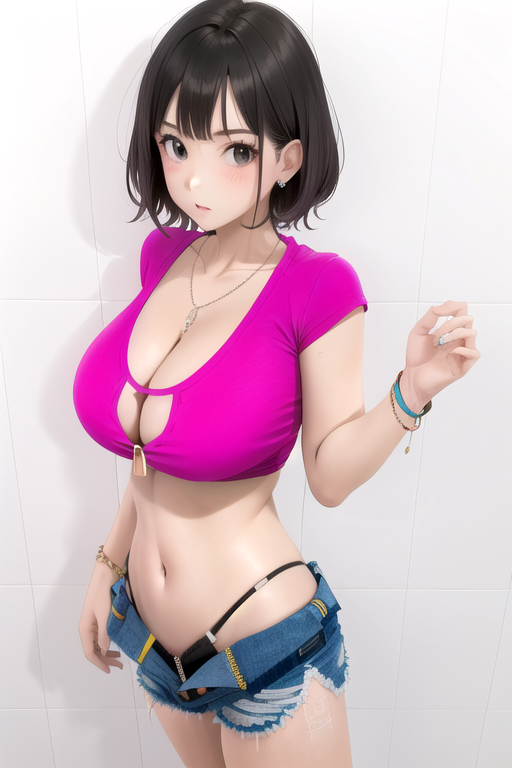 PinkKaho, 1girl, solo, short hair, pink shirt, large breasts, brown hair, black hair, navel, cleavage, jewelry, short shorts, midriff, black eyes, crop top, blue shorts, unbuttoned, unzipped, open fly, cropped shirt, cutoffs, open shorts,