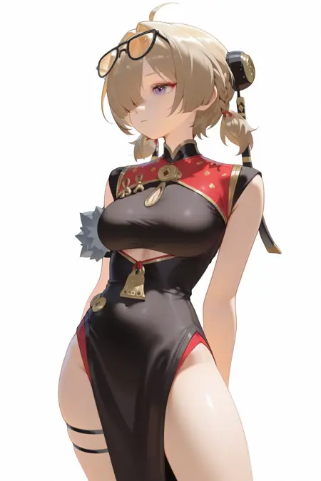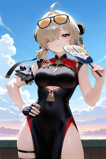 sweety \(zenless zone zero\), 1girl, purple eyes, eyewear on head, dress, china dress, chinese clothes, hair over one eye, gloves, thigh strap, cleavage cutout, clothing cutout, cleavage, ahoge, black gloves, fingerless gloves, black dress, twintails, sunglasses, sleeveless dress, bare shoulders, sleeveless, short twintails