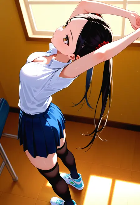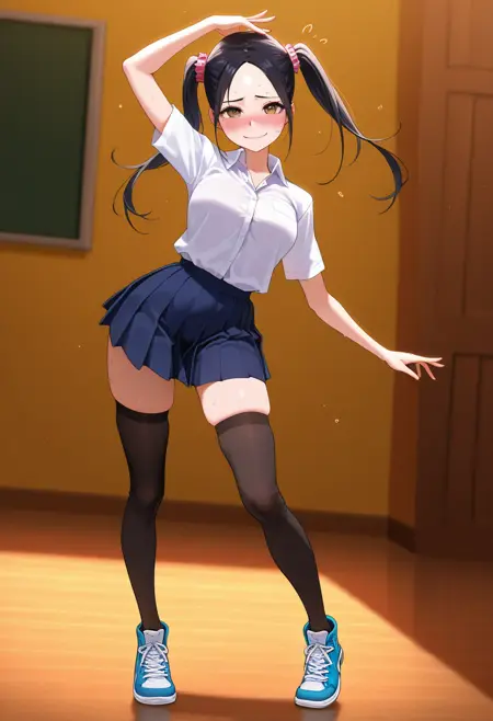• 暴露的服装,胸部,下胸围,肚脐,腰部,迷你裙,内裤,条纹过膝袜,运动鞋,
