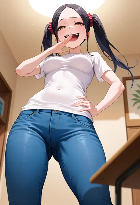 • nanashiww, brown eyes, black hair, long hair, twintails, hair scrunchie, parted bangs, medium breasts,