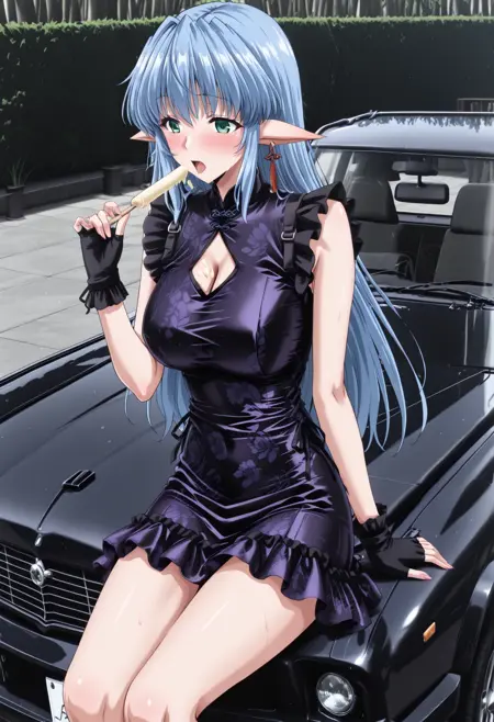 1girl, sylphy323inyutsuno1yakata, 1girl, pointed ears, green eyes, long hair, bangs, blue hair, big breasts,