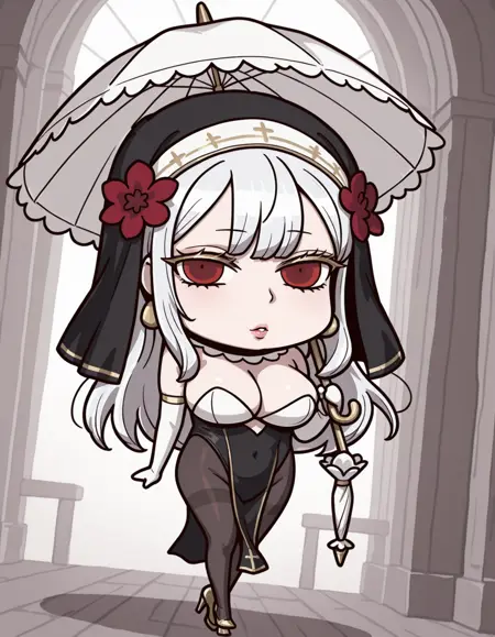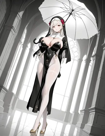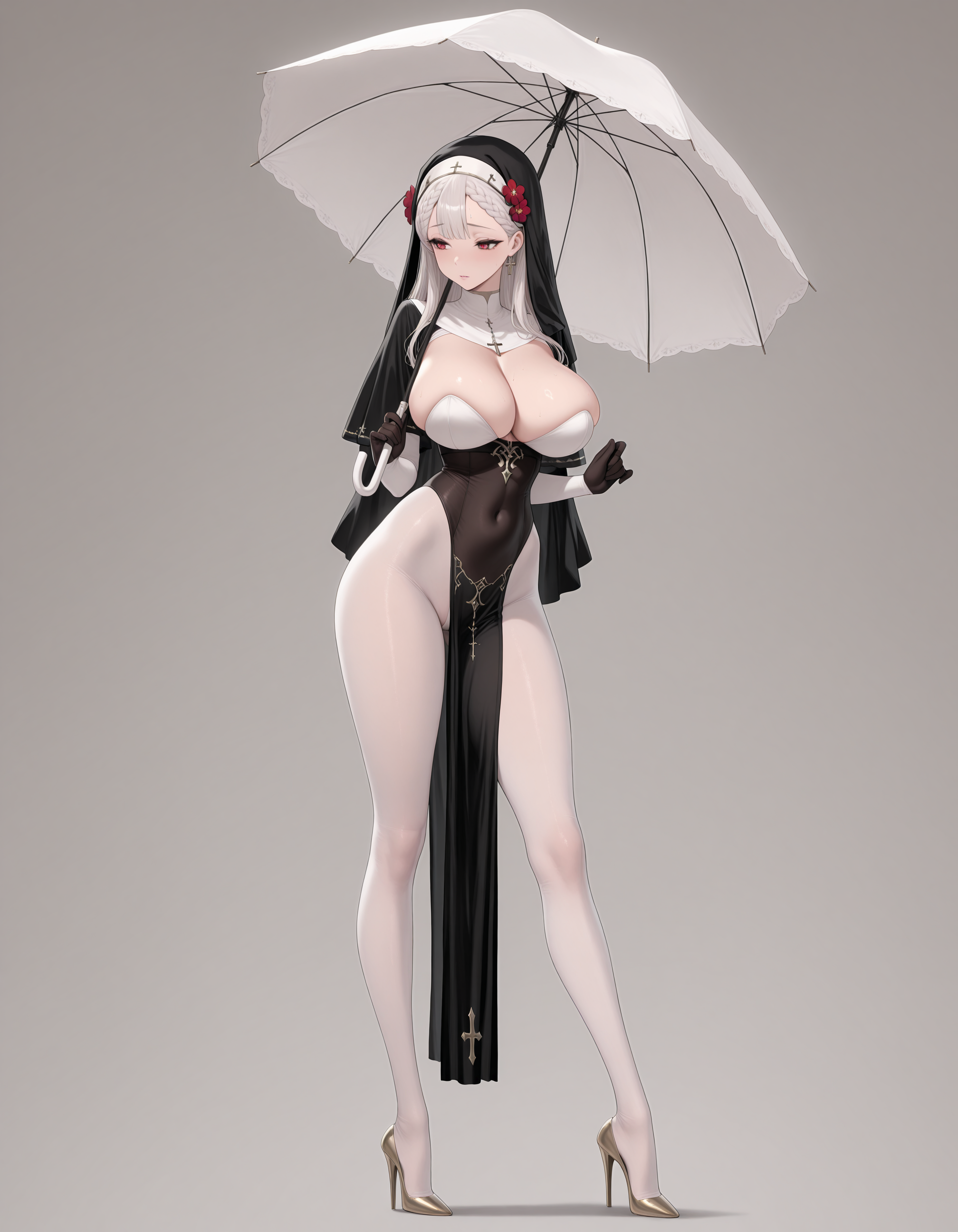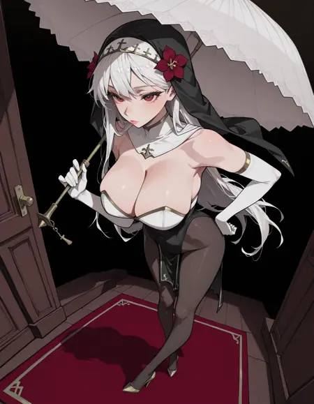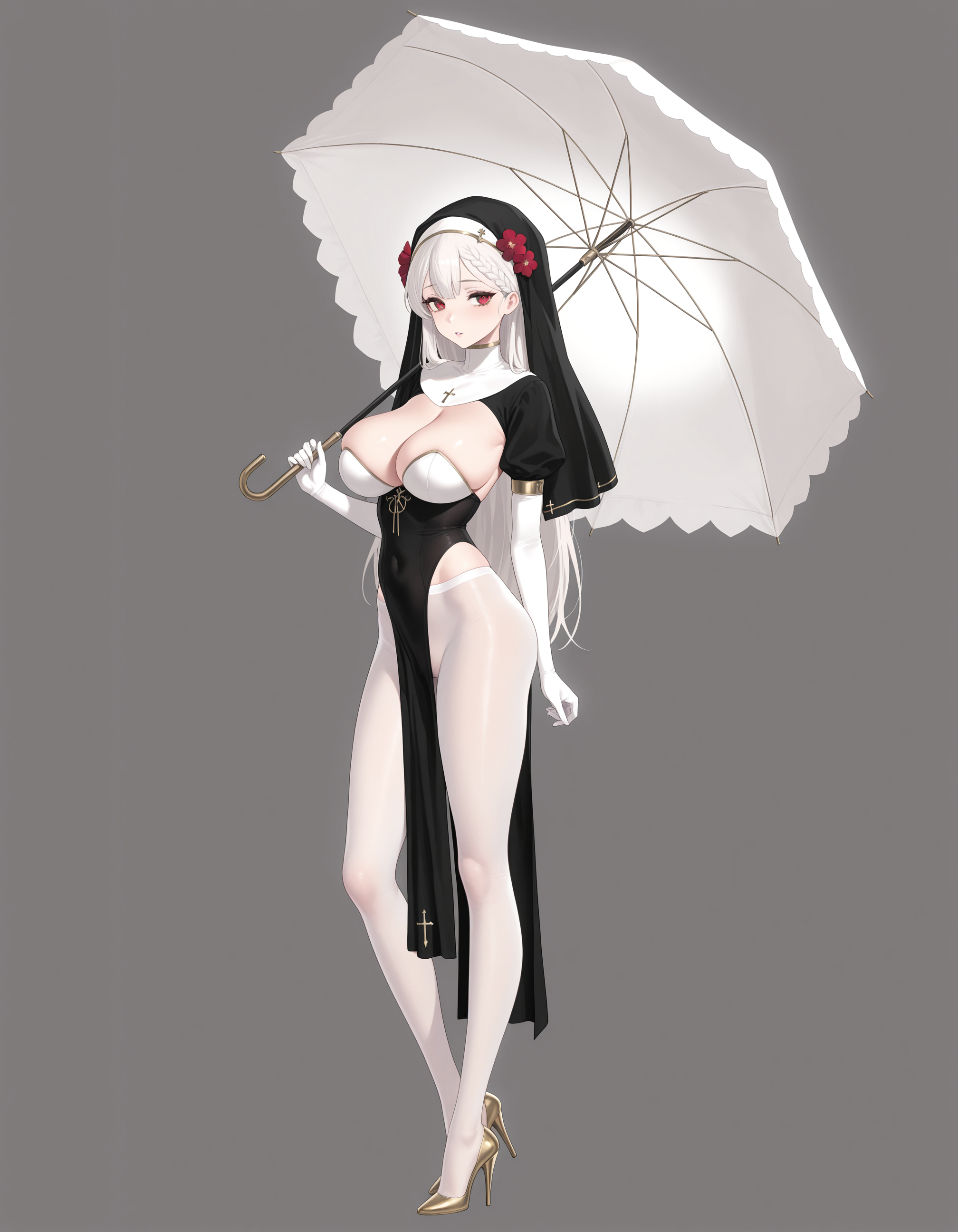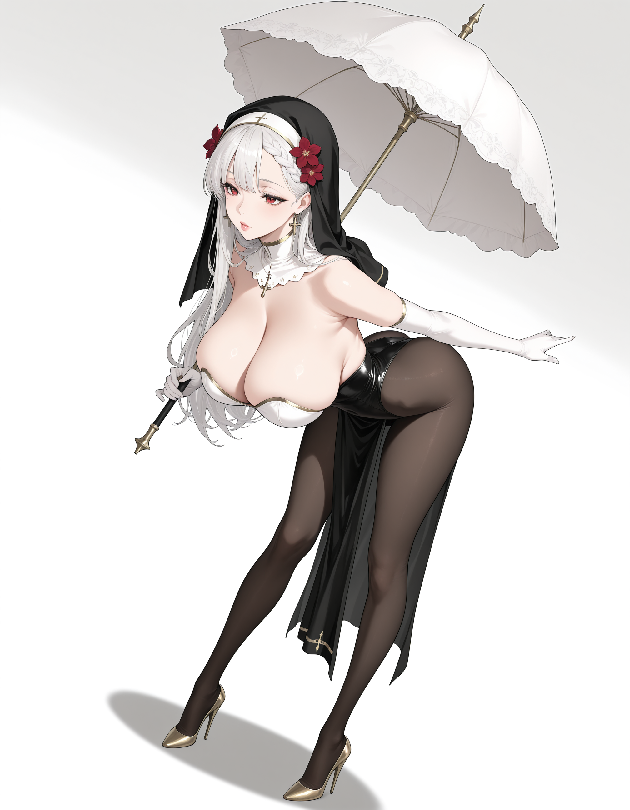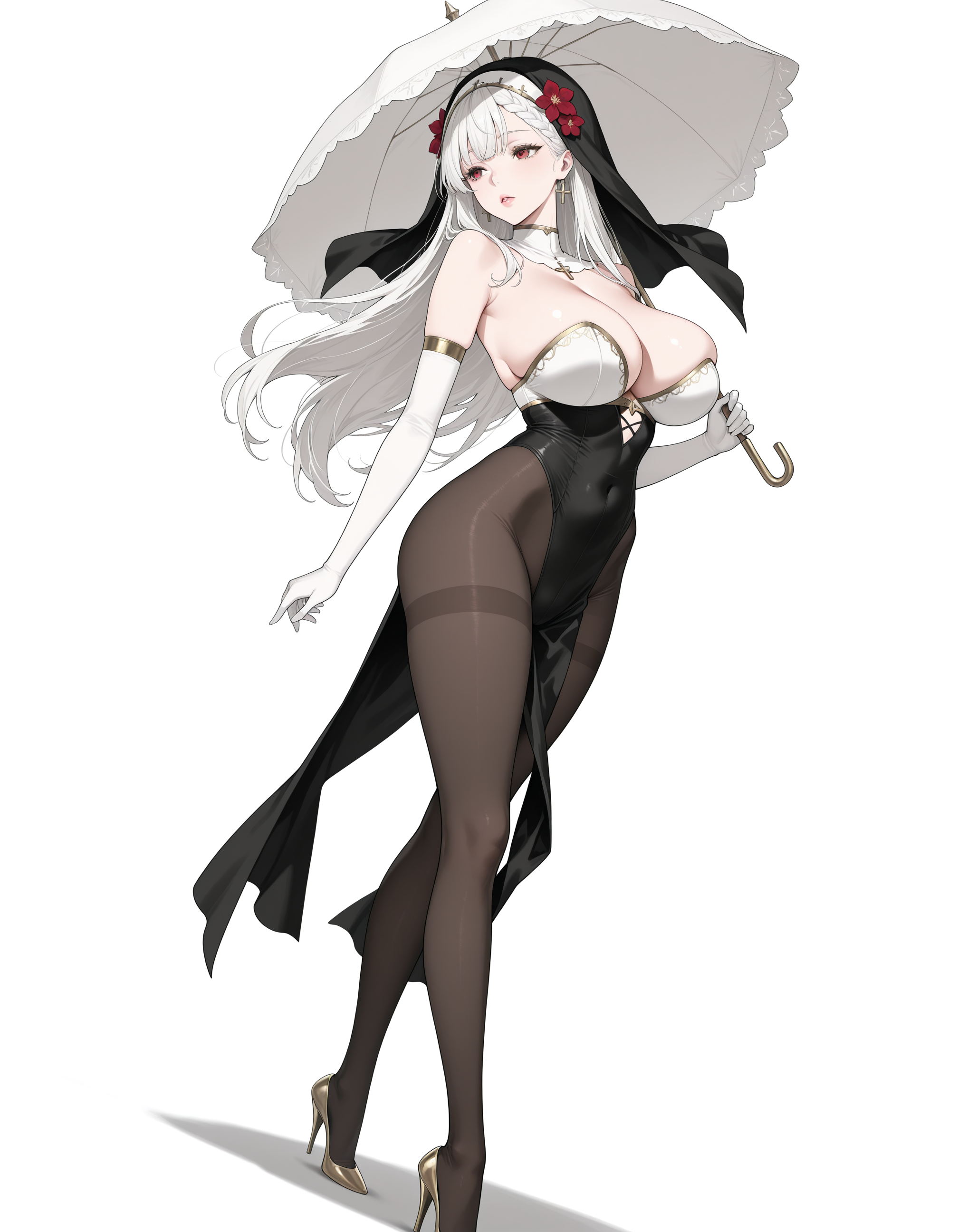 1girl,skinny,mature female,(aged up:1.2),nun,mai_thornsin_nun,long_hair,large_breasts,red_eyes,eyelashes,lips,cleavage,veil,hair_ornament,hair_flower,red_flower,white elbow gloves,golden eyelashes,lips,pelvic_curtain,black_pantyhose,black leotard,golden high_heels,white parasol,white strapless bra