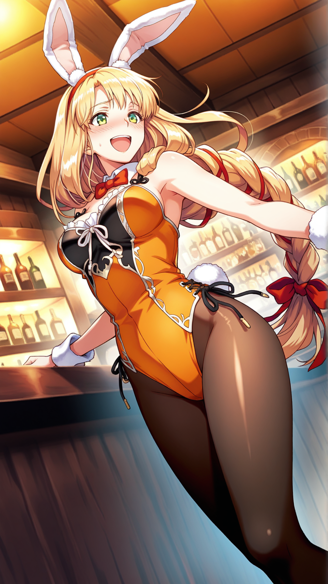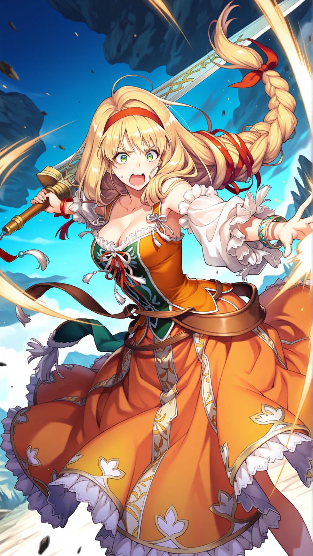 Outfit:hairband, hair ribbon, cleavage, orange dress, jewelry, corset, detached sleeves, bracelet,